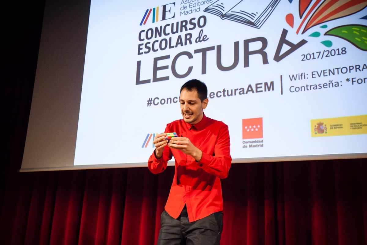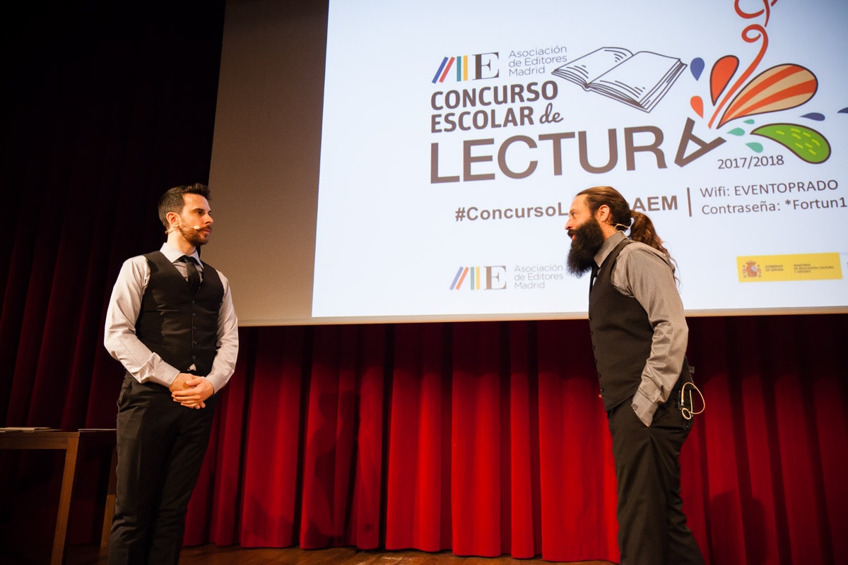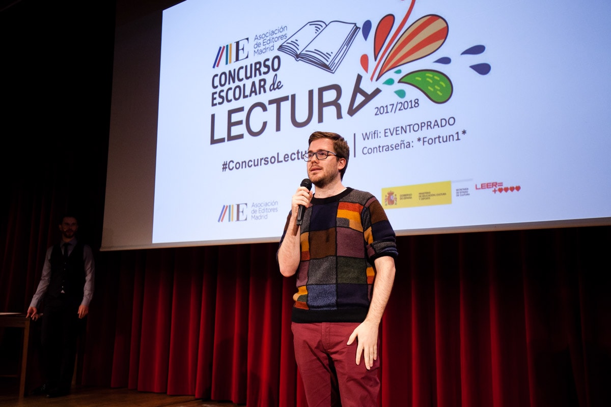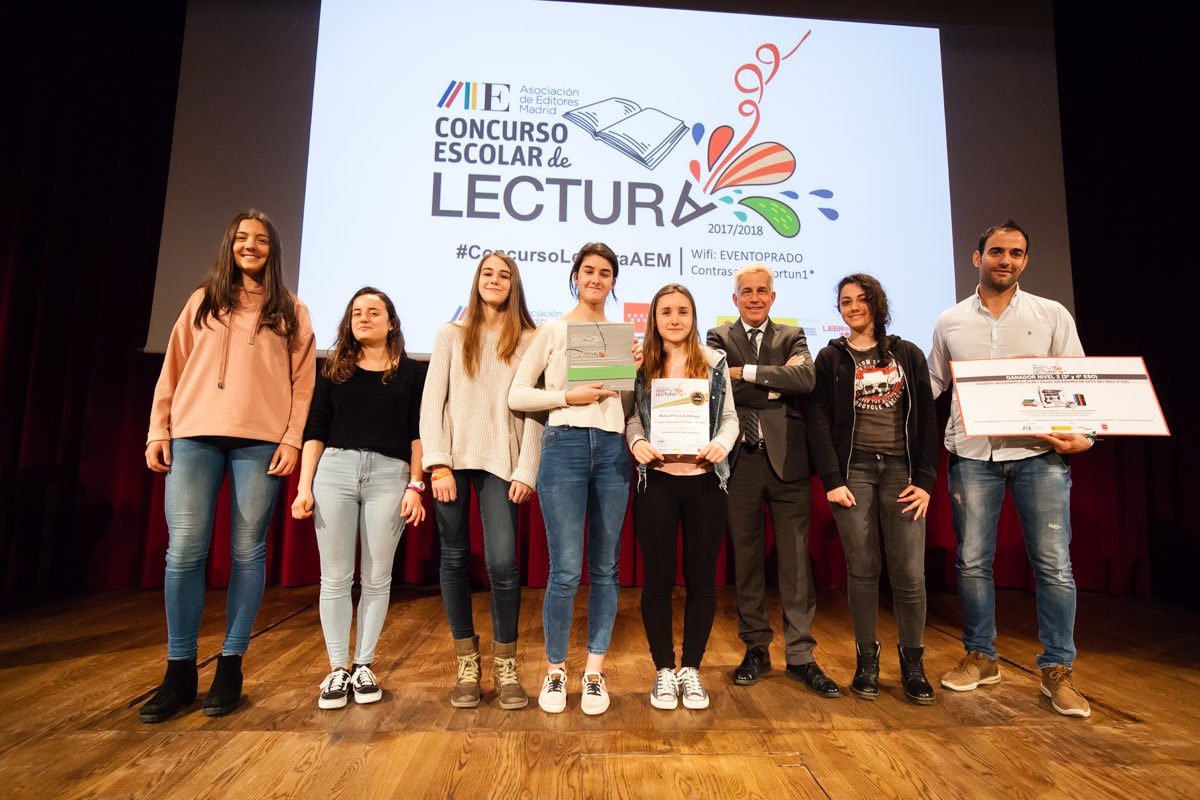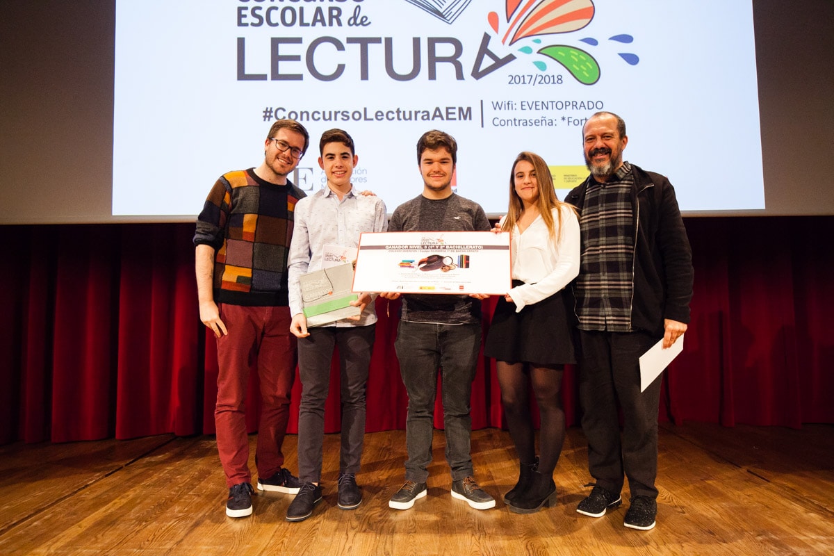 Ganador del Nivel 3 (Alumnos de 1° y 2° curso de BACHILLERATO) del Concurso Escolar de Lectura AEM 2017-2018. Foto con el Equipo FILOSOFÍA 1º DE BACHILLERATO del Colegio Quercus y su profesor Ignacio Moreno Rodríguez. Hizo entrega de los premios Javier Ruescas. Autor de literatura juvenil, editor y booktuber con más seguidores en España.